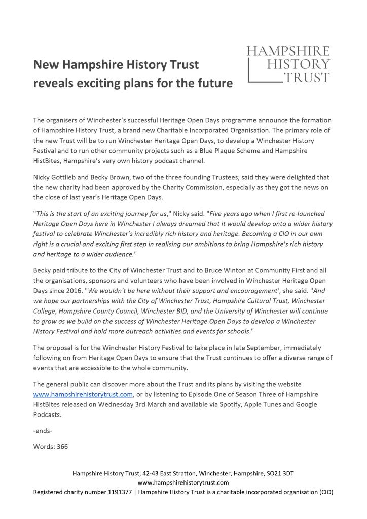 A copy of the full press release can be found below. The general public can discover more about the Trust and its plans by listening to Episode One of Season Three of Hampshire HistBites. It will be released here at 11am on Wednesday 3rd March.